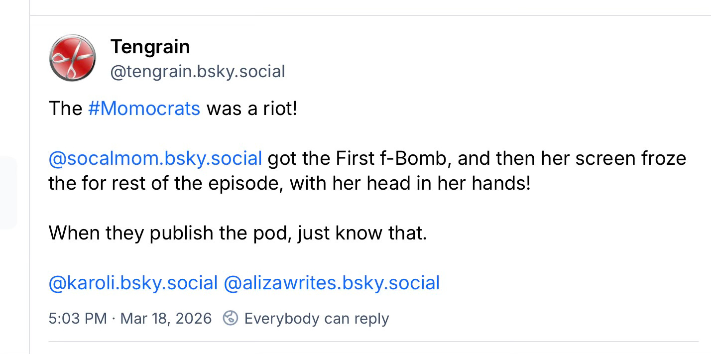 We are still getting used to using Substack as our video platform. Some of its functions are really robust - but a little glitchy. We’ve had instances in the past where one of us was frozen or could not even get onto the platform (this is why we changed the time for our weekly live chat when we realized that at 6 PM Eastern time, we were competing for resources with huge publishers, like Joy Reid and Jim Acosta).