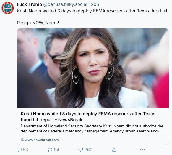 One week later, this tragedy is ongoing. People are wondering how much DOGE’s cuts to the National Weather Service and NOAA factored into it. Journalist Marisa Kabas has reported that as of Monday, only 86 FEMA employees were on the ground in Texas (they usually deploy hundreds of people to disaster zones like this). “We are doing a lot less than normal,” a FEMA staffer told her.